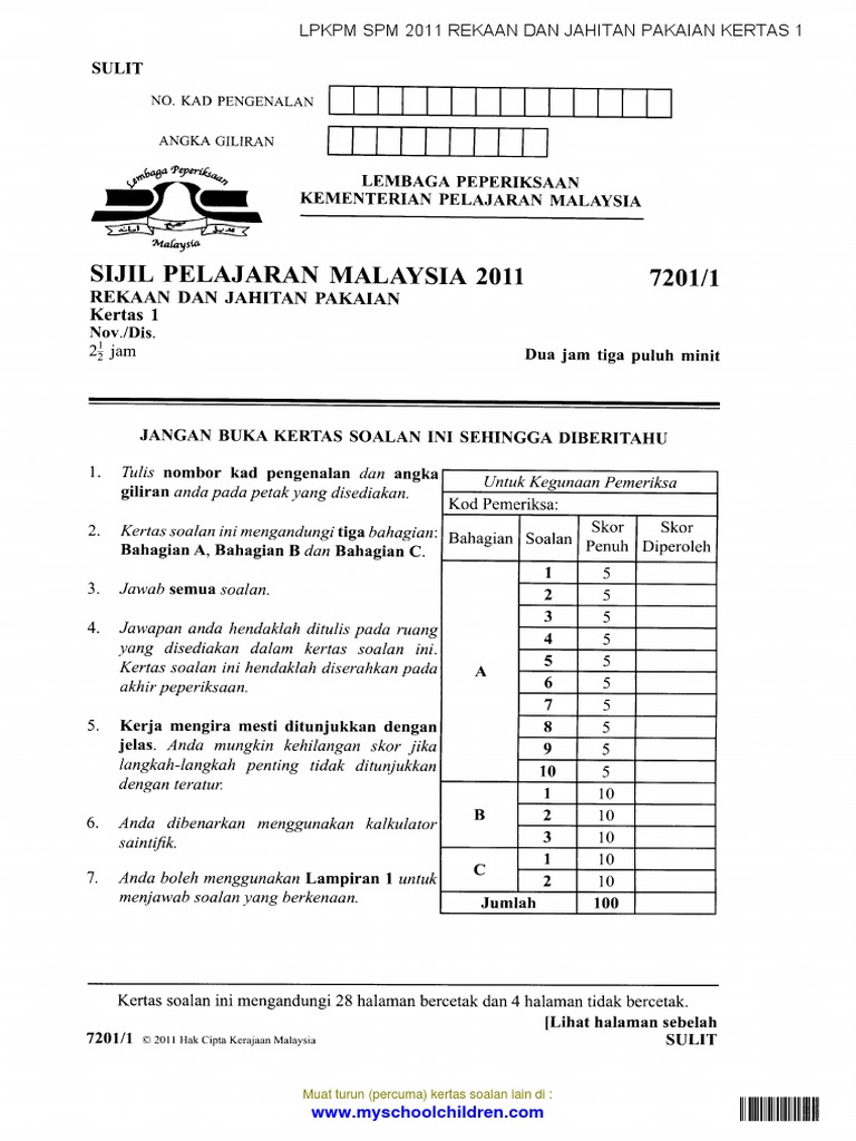 Lpkpm Spm 2011 Rekaan Dan Jahitan Pakaian Kertas 1 Pdf